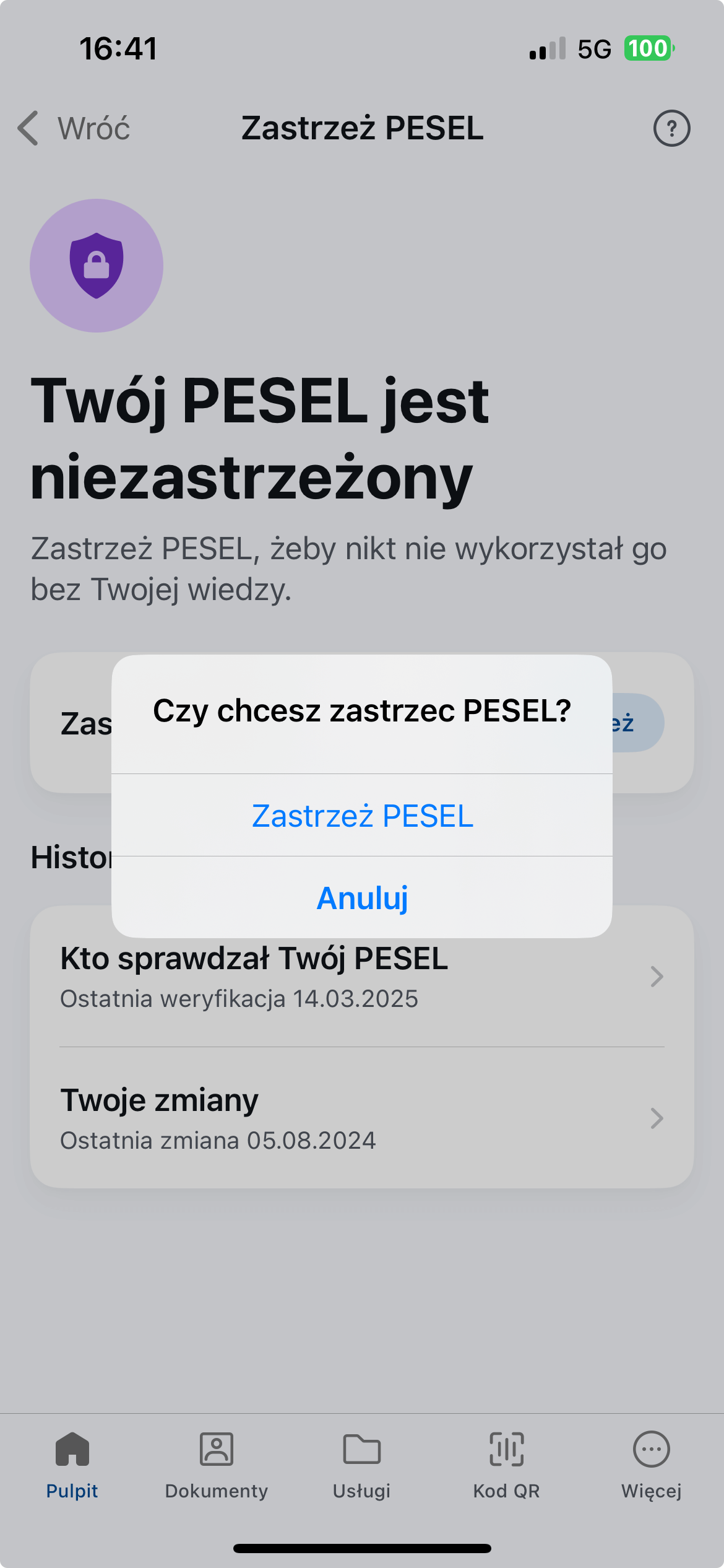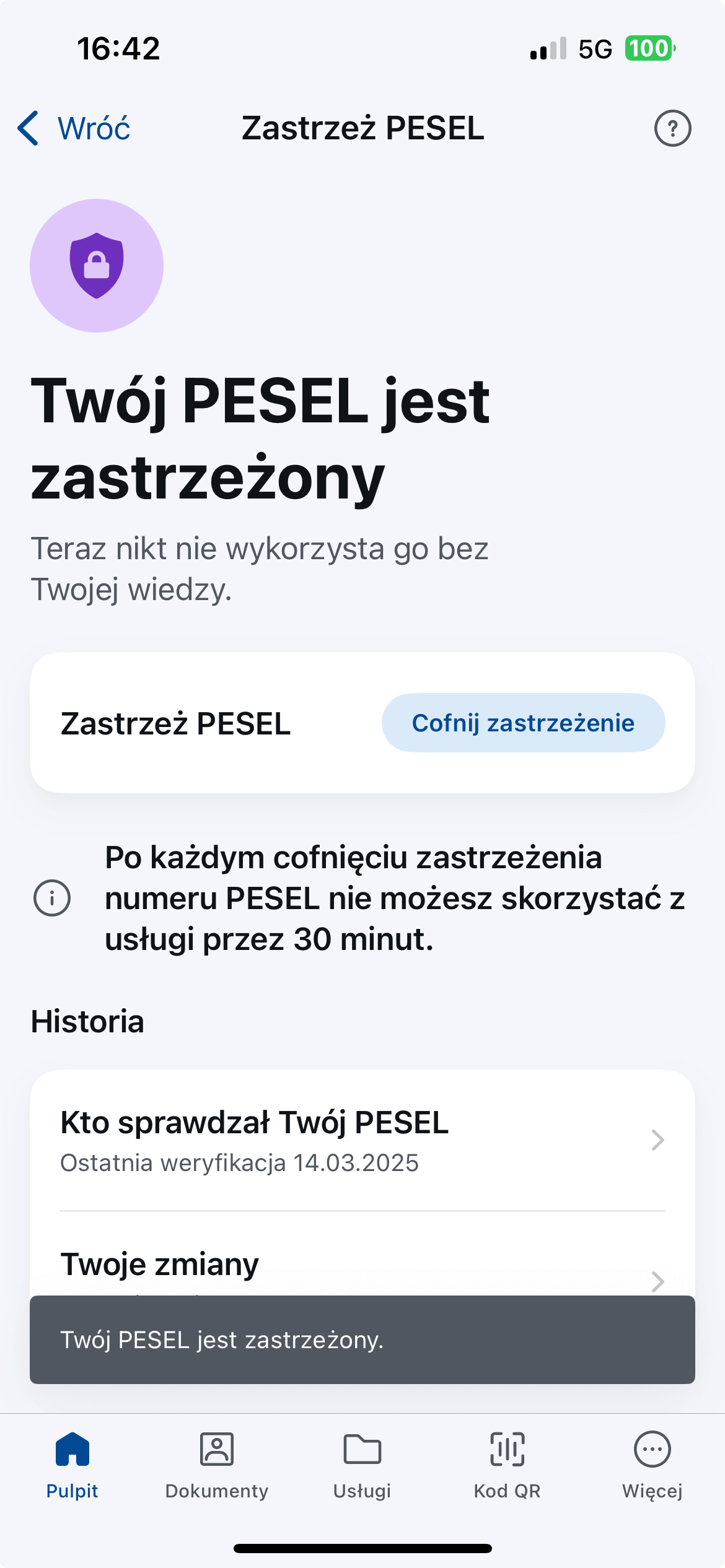- przesuń suwak w prawo, jeśli chcesz zastrzec PESEL,